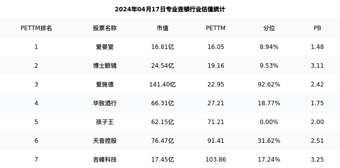 从估值角度看:爱婴室最新市盈率PETTM为16.05,在行业内排名1/7,处于8.94分位。