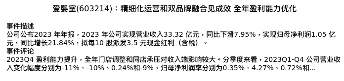 值得注意的是:2024年04月长江证券的李锦/罗祎/陈佳分析师,首次发布关于爱婴室的研究报告,标题为:爱婴室(603214):精细化运营和双品牌融合见成效 全年盈利能力优化。