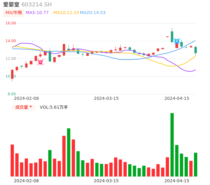04月15日,爱婴室收报12.63,股价涨幅-5.75%,成交金额7176.18万元,换手率3.99%。
