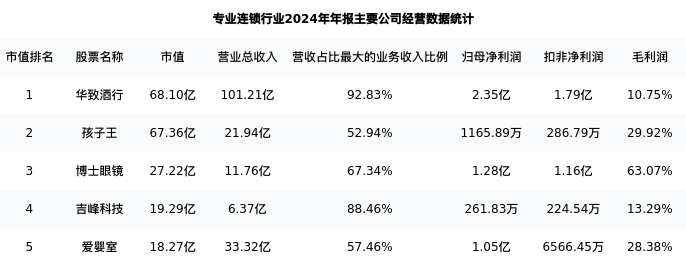 爱婴室最新报告期数据为年报,下表汇总了专业连锁行业内市值靠前的公司年报主要经营数据