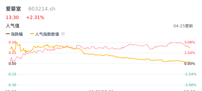 04月25日,爱婴室收报13.30,股价涨幅2.31%,成交金额3679.48万元,换手率1.97%。