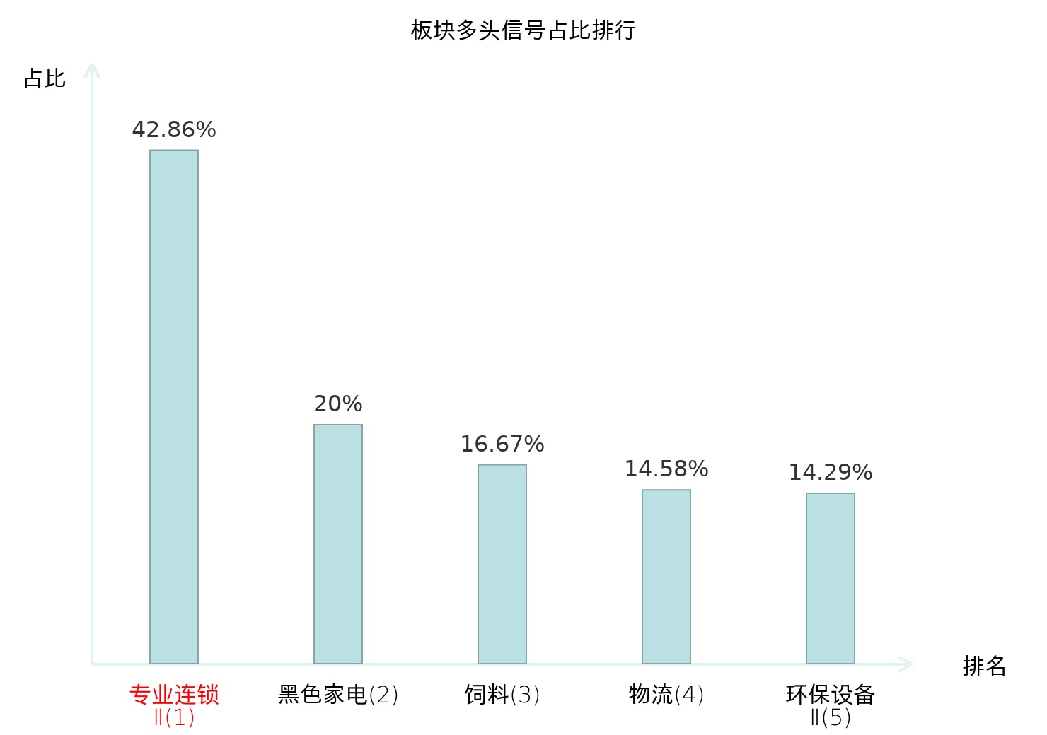 全市场所有行业板块中主力多头信号占比排名中,专业连锁Ⅱ板块位居第一。专业连锁Ⅱ板块名次提升最快,较昨日上升122位。