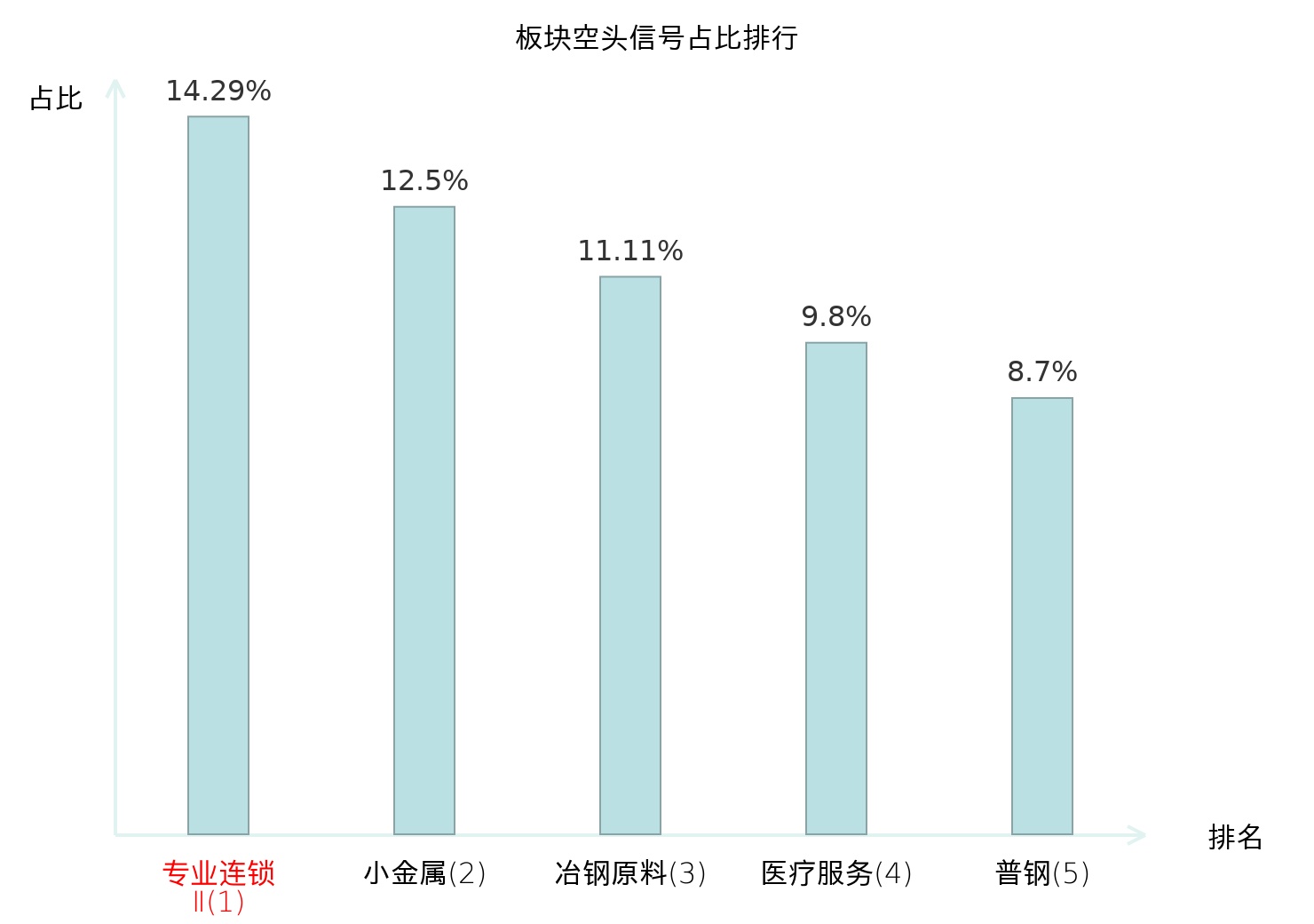 全市场所有行业板块中主力空头信号占比排名中,专业连锁Ⅱ板块位居第一。军工电子Ⅱ板块名次提升最快,较昨日上升106位。
