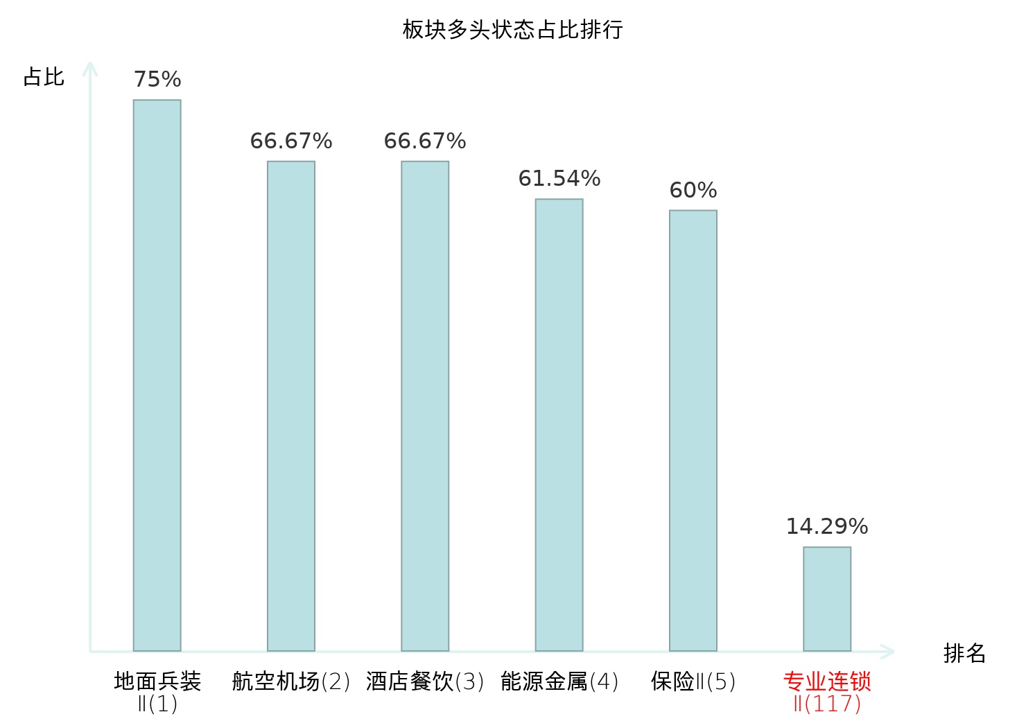 全市场所有行业板块中主力多头状态占比排名中,地面兵装Ⅱ板块位居第一。航天装备Ⅱ板块名次提升最快,较昨日上升103位。