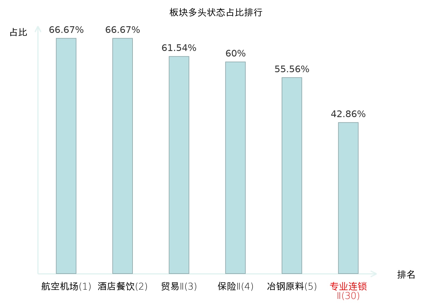 全市场所有行业板块中主力多头状态占比排名中,航空机场板块位居第一。农业综合Ⅱ板块名次提升最快,较昨日上升64位。