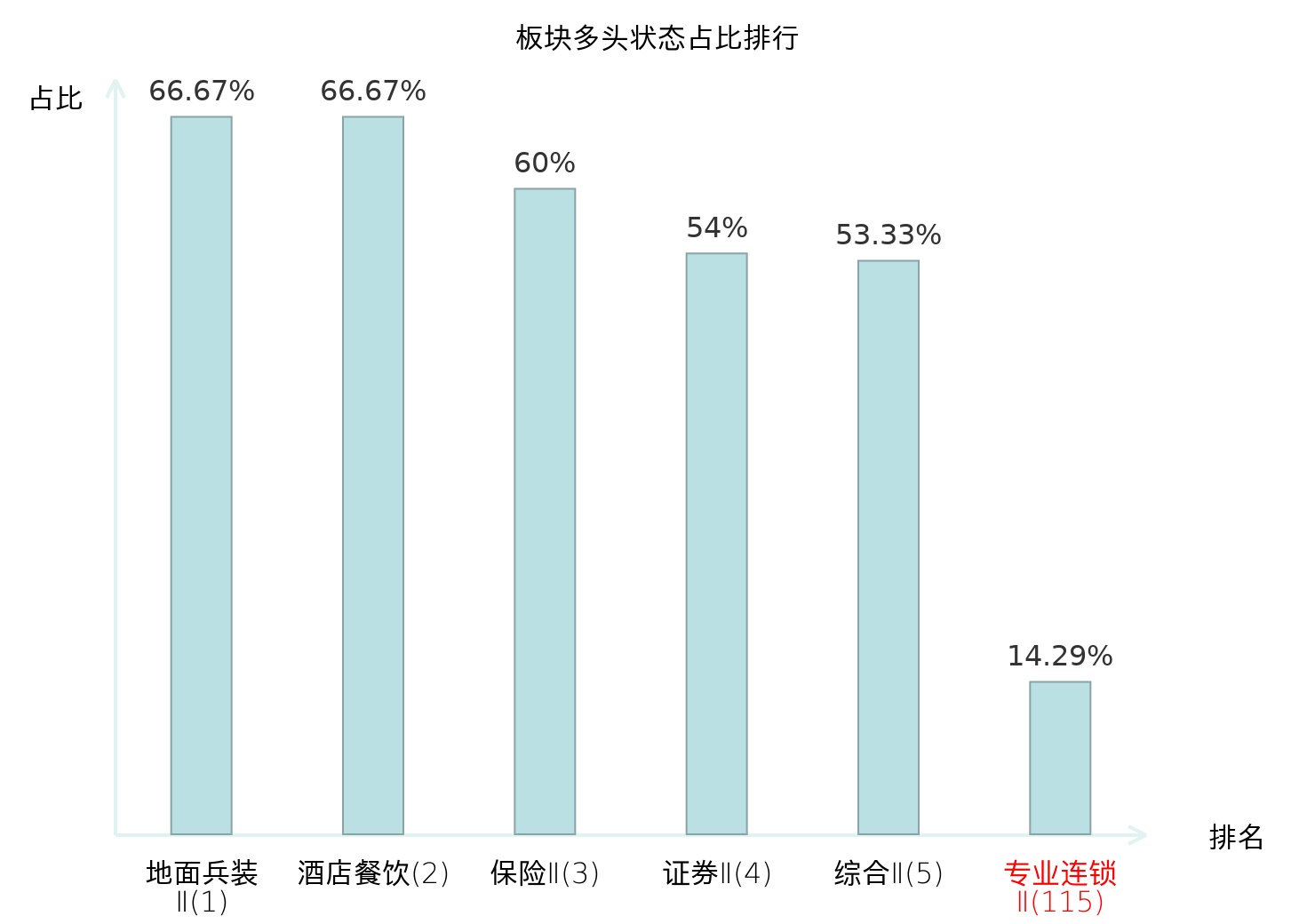 全市场所有行业板块中主力多头状态占比排名中,地面兵装Ⅱ板块位居第一。计算机设备板块名次提升最快,较昨日上升48位。