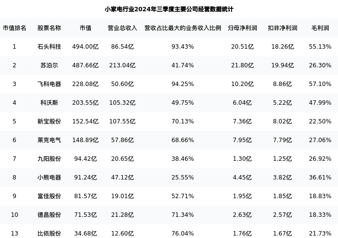 比依股份最新报告期数据为三季度,下表汇总了小家电行业内市值靠前的公司三季度主要经营数据