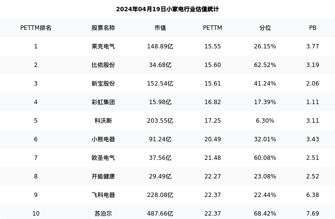 从估值角度看:比依股份最新市盈率PETTM为15.60,在行业内排名2/20,处于62.52分位。