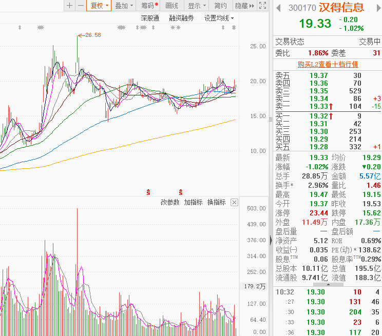 汉得信息是AI智能体+信创概念股,近1年股价随AI算力需求和企业数字化转型的井喷顺势上升(优于大市),阶段性底部逐步抬高,当前股价和估值对比业绩预期仍处于低估区间,后市增长空间巨大,十大流通股东中有多家社保基金、险资和公募机构的身影,深受游资和主力的喜爱,市值100多亿左右易炒作;近期在“中报预增”和“机构资金增持”的事件催化下,快速震荡上行且放量数倍的成交额,各周期均线呈多头排列向上,股价站稳在各均线之上,技术面上金叉信号(5日MACD和10日MACD)已显现,股价有望进一步加速。