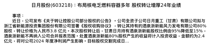 值得注意的是:2024年03月国信证券的王蔚祺/王晓声分析师,首次发布关于日月股份的研究报告,标题为:日月股份(603218):布局核电乏燃料容器多年 股权转让增厚24年业绩。