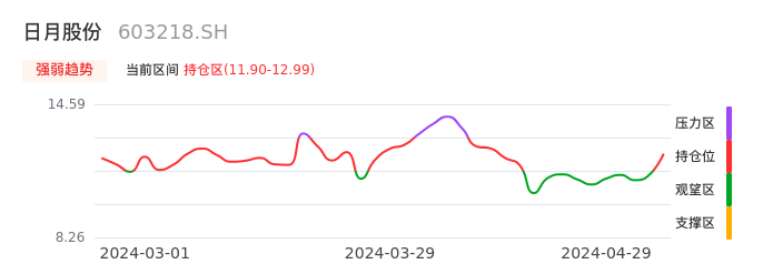 我们来看一下该股的九方特色指标强弱趋势的情况:日月股份近日从观望区上穿到持仓区。股价短期站稳多头区域,上升动能仍较为充足,可积极关注。后续重点关注上方压力位:12.99元是否能突破上攻。
