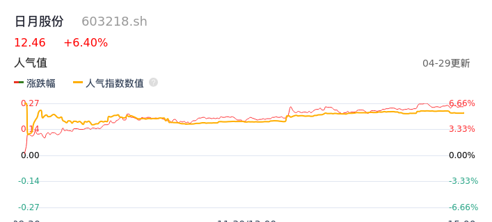 04月29日,日月股份收报12.46,股价涨幅6.40%,成交金额2.90亿元,换手率2.45%。