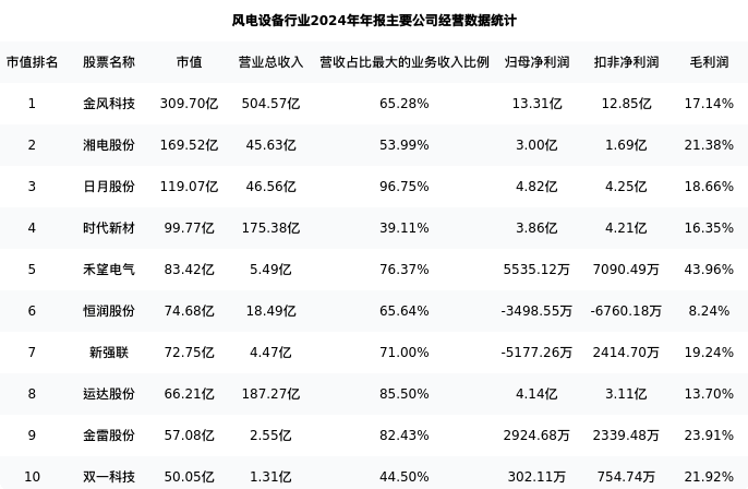 日月股份最新报告期数据为年报,下表汇总了风电设备行业内市值靠前的公司年报主要经营数据