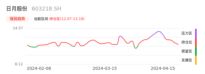 我们来看一下该股的九方特色指标强弱趋势的情况:日月股份自04月10日从压力区回到持仓区。股价近期持续调整。后续重点关注能否站稳多空分界点:12.07元。如被有效击穿则将进入空头行情。