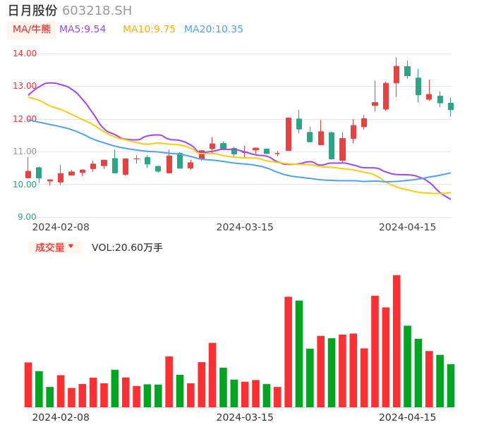 04月15日,日月股份收报12.28,股价涨幅-1.68%,成交金额2.54亿元,换手率2.13%。