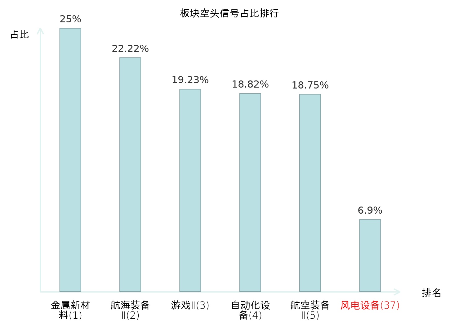 全市场所有行业板块中主力空头信号占比排名中,金属新材料板块位居第一。证券Ⅱ板块名次提升最快,较昨日上升120位。