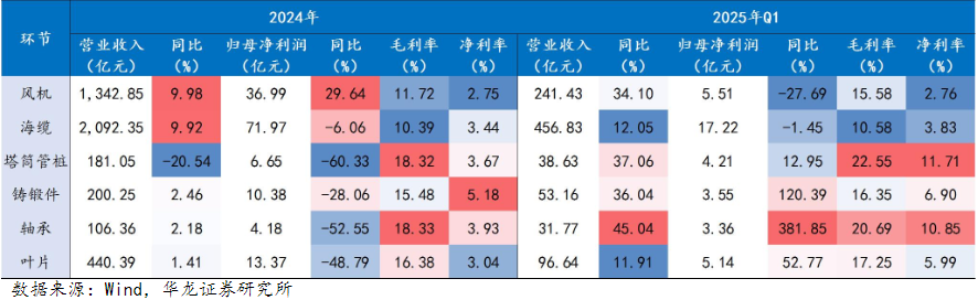 2025年二季度业绩增速来看,风机、海缆净利润同比下滑,增速分别下滑27.69%/1.45%;轴承、铸锻件、叶片环节净利润大幅提升,增速分别为381.85%/120.39%/52.77%,主要受益于需求放量、涨价和产品结构优化。