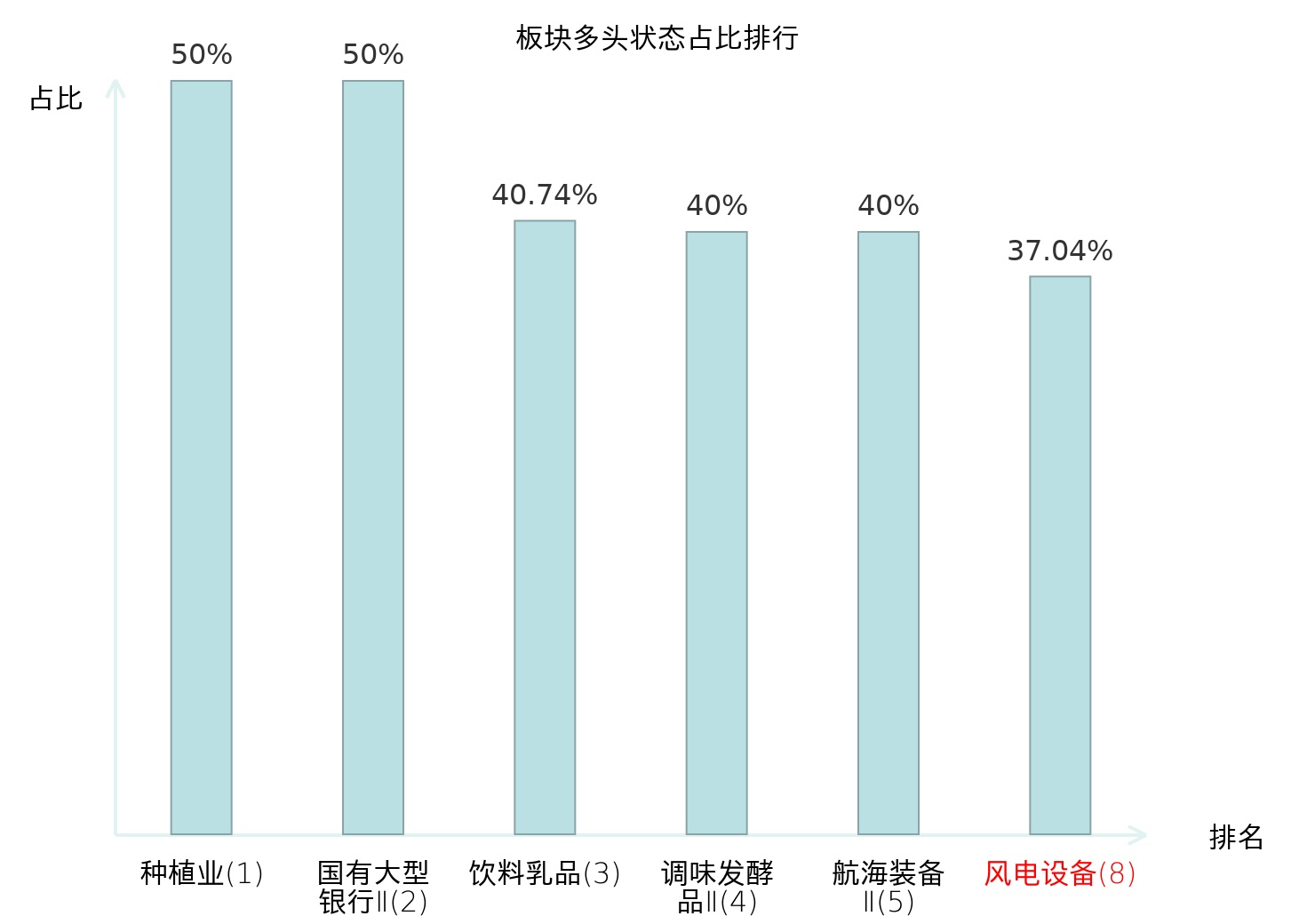 全市场所有行业板块中主力多头状态占比排名中,种植业板块位居第一。冶钢原料板块名次提升最快,较昨日上升89位。