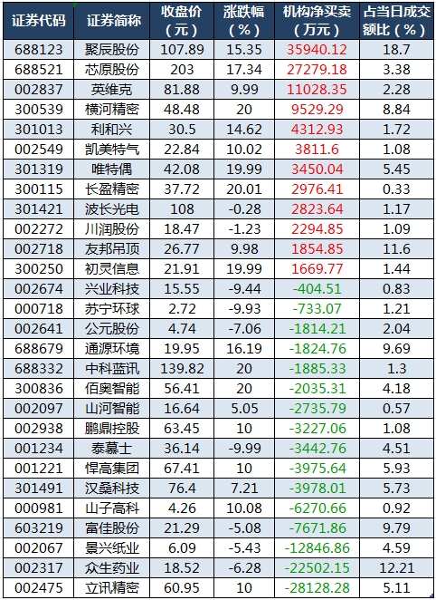 盘后龙虎榜数据显示,今日机构席位资金合计净买入约3494.77万元。其中,净买入的个股12只,净卖出的个股16只。机构净买入最多的股票是聚辰股份,净买入金额约3.59亿元;机构净买入居前的还有芯原股份、英维克、横河精密等股。机构净卖出最多的股票是立讯精密,净卖出金额约2.81亿元;机构净卖出居前的还有众生药业、景兴纸业、富佳股份等股。