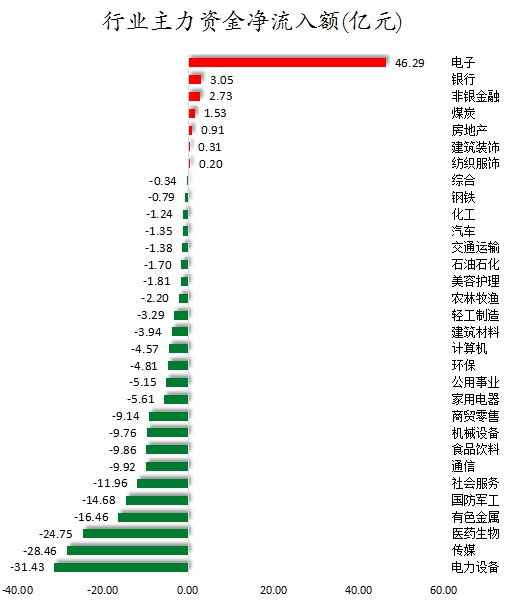从行业来看,申万所属的31个一级行业,今日有7个行业主力资金呈现净流入,其中,电子行业主力资金净流入最多,净流入金额为46.29亿元;行业主力资金净流入居前的还有银行、非银金融等,净流入金额分别为3.05亿元、2.73亿元。24个行业主力资金呈现净流出,其中,电力设备行业主力资金净流出最多,净流出金额为31.43亿元;行业主力资金净流出靠前的还有传媒、医药生物、有色金属、国防军工、社会服务等,净流出金额分别为28.46亿元、24.75亿元、16.46亿元、14.68亿元、11.96亿元。