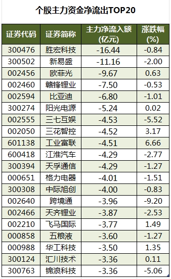 今日有3021只个股被主力资金净卖出,其中,114股被主力资金净卖出超1亿元。主力资金净流出最多的个股是胜宏科技,净流出金额为16.44亿元;主力资金净流出居前的个股还有新易盛、欧菲光、赣锋锂业、比亚迪、阳光电源等,净流出金额分别为11.16亿元、9.67亿元、7.5亿元、6.8亿元、5.24亿元。
