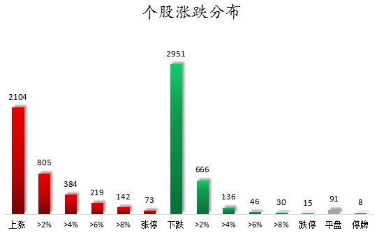 个股涨跌情况,截至收盘,沪深两市合计2104只个股上涨,2951只个股下跌,平盘个股91只,停牌的个股8只。不含当日上市新股,共有73只个股涨停,15只个股跌停。