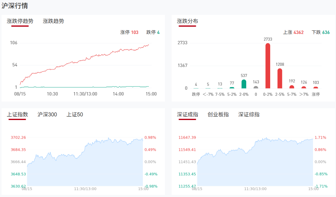 市场全天震荡反弹,创业板指领涨。沪深两市全天成交额2.24万亿,较上个交易日缩量346亿。盘面上,市场热点较为杂乱,个股涨多跌少,全市场超4600只个股上涨。从板块来看,券商、金融科技等大金融股集体大涨,指南针、同花顺双双创历史新高。PCB、液冷服务器概念股再度爆发,川环科技等多股涨停。光伏概念股展开反弹,欧晶科技涨停。