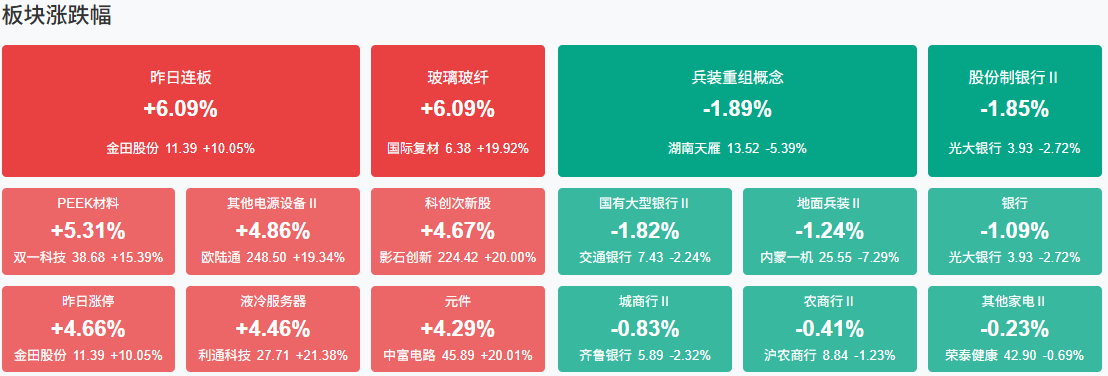板块方面,PEEK材料、液冷服务器、PCB、证券等板块涨幅居前,银行等少数板块下跌。截至收盘,沪指涨0.83%,深成指涨1.6%,创业板指涨2.61%。