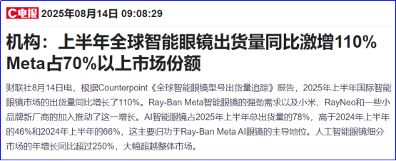 另外最近关于AI眼镜的消息也不少,但是受AI、机器人、军工、医药这些大题材的影响,遮盖了板块的表现,上半年全球的智能眼镜出货量同比增加超1倍多,叠加上海对智能消费终端的政策刺激,这边是可以考虑做选股的。龙头科森科技,叠加苹果的折叠屏已经3个板,领益智造中军也有2个板,有龙头股的标杆效应,就有挖掘的潜力,像佳禾智能、胜利精密都可以多留意,趋势都还可以。