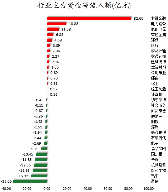 从行业来看,申万所属的31个一级行业,今日有15个行业主力资金呈现净流入,其中,非银金融行业主力资金净流入最多,净流入金额为82.6亿元;行业主力资金净流入居前的还有电力设备、家用电器、有色金属、环保、银行等,净流入金额分别为18.88亿元、11.58亿元、6.33亿元、4.68亿元、3.09亿元。16个行业主力资金呈现净流出,其中,通信行业主力资金净流出最多,净流出金额为33.05亿元;行业主力资金净流出靠前的还有汽车、医药生物、机械设备、传媒、国防军工等,净流出金额分别为15.32亿元、13.98亿元、12.86亿元、11.86亿元、10.45亿元。