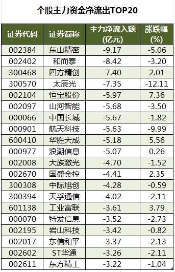 今日有2857只个股被主力资金净卖出,其中,80股被主力资金净卖出超1亿元。主力资金净流出最多的个股是东山精密,净流出金额为9.17亿元;主力资金净流出居前的个股还有和而泰、四方精创、太辰光、恒宝股份、山河智能等,净流出金额分别为8.42亿元、7.4亿元、7.35亿元、5.97亿元、5.68亿元。