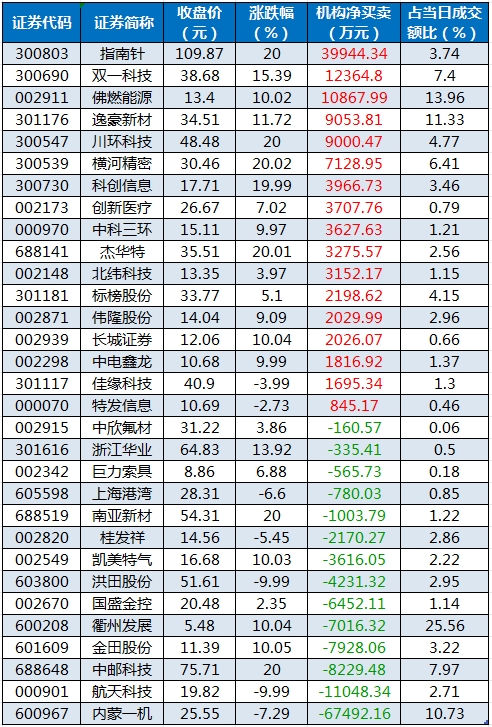 盘后龙虎榜数据显示,今日机构席位资金合计净卖出约4327.31万元。其中,净买入的个股17只,净卖出的个股14只。机构净买入最多的股票是指南针,净买入金额约3.99亿元;机构净买入居前的还有双一科技、佛燃能源、逸豪新材、川环科技、横河精密等股。机构净卖出最多的股票是内蒙一机,净卖出金额约6.75亿元;机构净卖出居前的还有航天科技、中邮科技、金田股份等股。