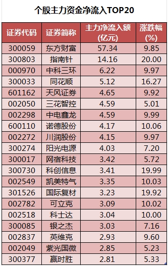 个股来看,今日有2284只个股获主力资金净流入,其中,100股获主力资金净流入超1亿元。东方财富主力资金净流入最多,净流入金额为57.34亿元;主力资金净流入居前的个股还有指南针、中科三环、同花顺、天风证券、三花智控等,净流入金额分别为14.16亿元、6.22亿元、5.12亿元、4.65亿元、4.59亿元。