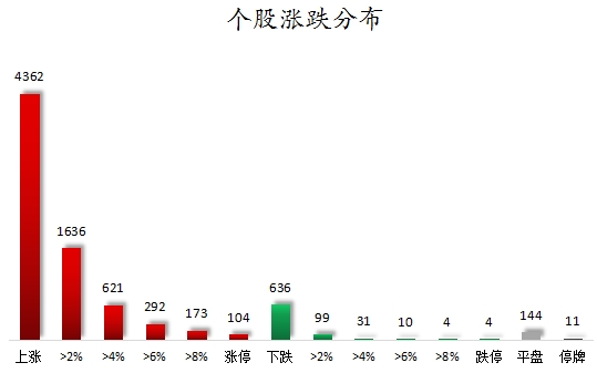 个股涨跌情况,截至收盘,沪深两市合计4362只个股上涨,636只个股下跌,平盘个股144只,停牌的个股11只。不含当日上市新股,共有104只个股涨停,4只个股跌停。