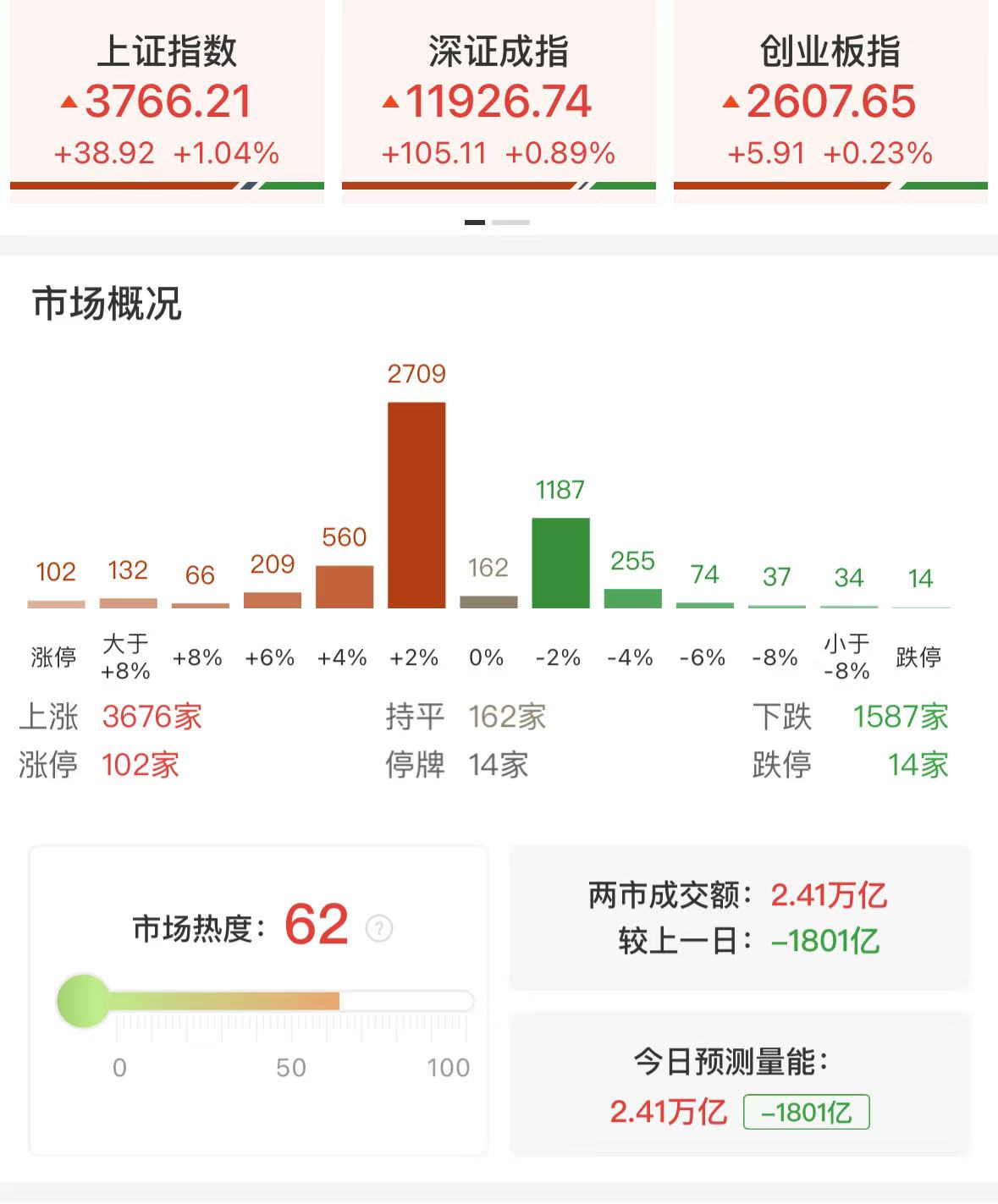 财联社8月20日讯,市场全天探底回升,沪指、深成指、科创50指数均创年内新高。沪深两市全天成交额2.41万亿,较上个交易日缩量1801亿,成交额连续6个交易日超2万亿。盘面上,市场热点较为杂乱,个股涨多跌少,全市场超3600只个股上涨。从板块来看,芯片股午后爆发,寒武纪再创历史新高。白酒等消费股展开反弹,酒鬼酒2连板。消费电子概念股表现活跃,安洁科技等涨停。下跌方面,高位股集体大跌,中恒电气等多股跌停。截至收盘,沪指涨1.04%,深成指涨0.89%,创业板指涨0.23%。