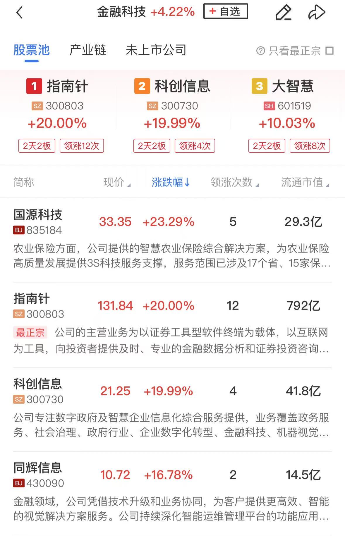 板块上,券商、金融科技股维持强势,指南针2连板续创历史新高,长城证券4连板,同花顺、财富趋势、古鳌科技涨超10%。