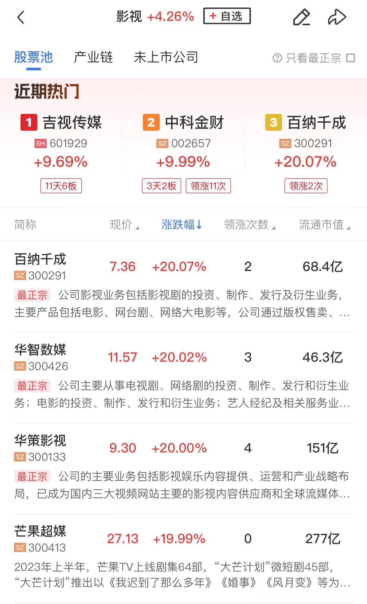 影视股表现活跃,百纳千成、华策影视、华策影视、慈文传媒、欢瑞世纪涨停,华谊兄弟、幸福蓝海、金逸影视涨幅居前。
