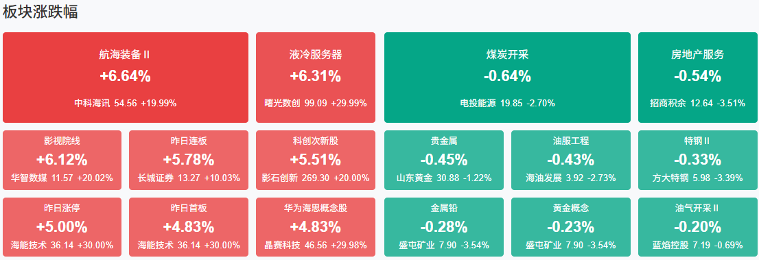 板块方面,液冷服务器、影视、CPO、稀土永磁等板块涨幅居前,煤炭、有色金属、钢铁等板块跌幅居前。截至收盘,沪指涨0.85%,深成指涨1.73%,创业板指涨2.84%。