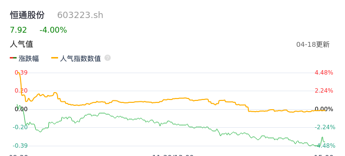 04月18日,恒通股份收报7.92,股价涨幅-4.00%,成交金额3459.24万元,换手率0.78%。