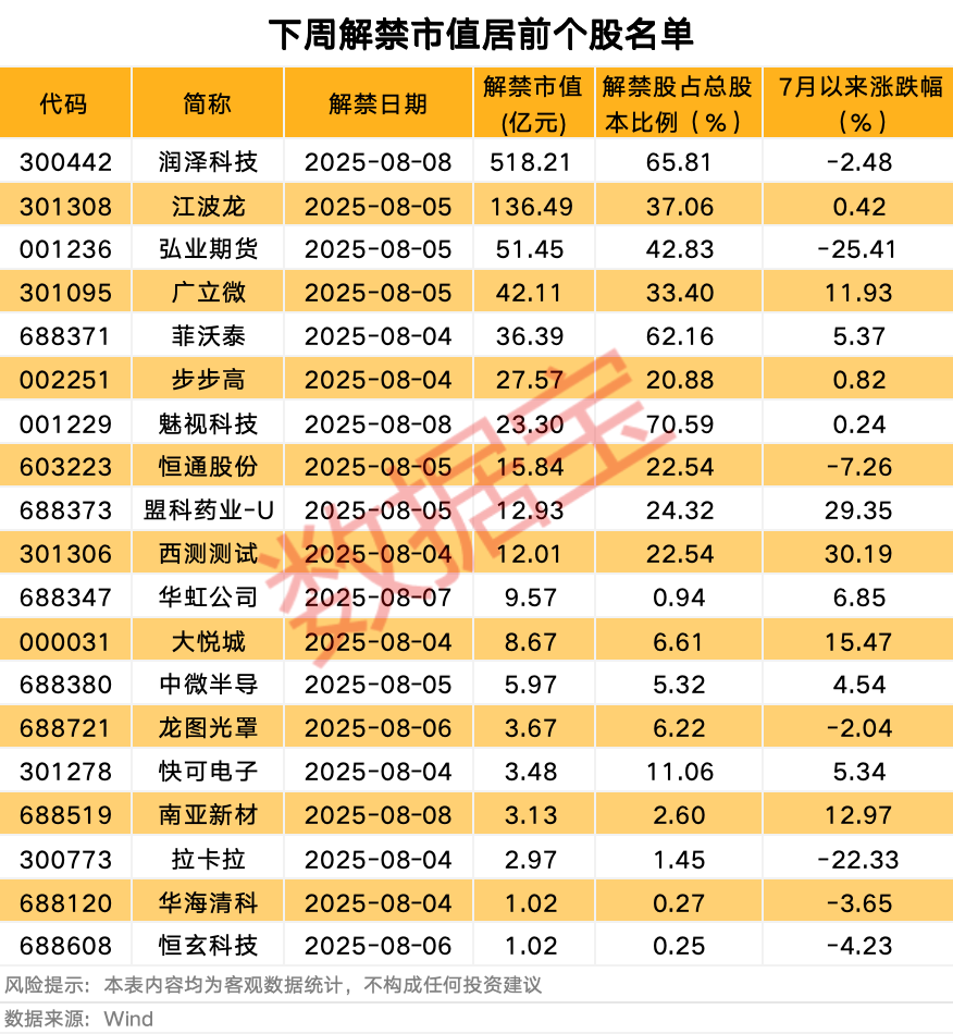 西测测试7月以来股价上涨30.19%,居首,下周该股将有1902万股面临解禁,解禁市值12.01亿元。