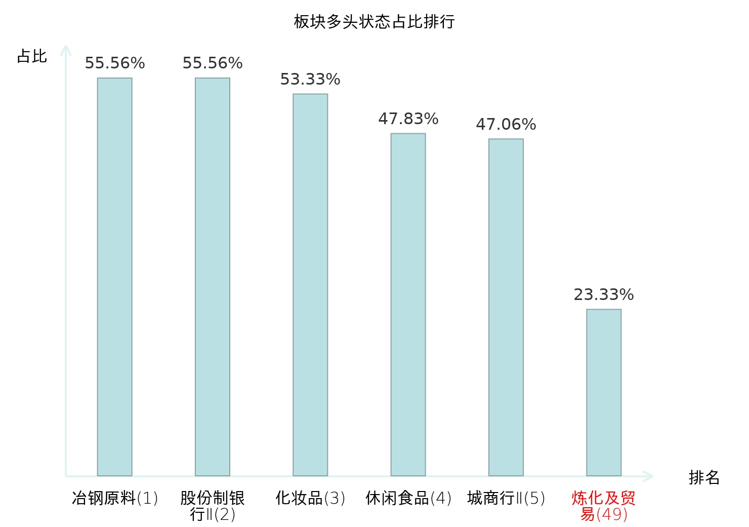 全市场所有行业板块中主力多头状态占比排名中,冶钢原料板块位居第一。其他家电Ⅱ板块名次提升最快,较昨日上升105位。