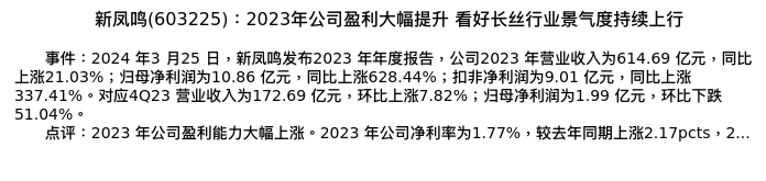 值得注意的是:2024年04月长城证券的肖亚平分析师,首次发布关于新凤鸣的研究报告,标题为:新凤鸣(603225):2023年公司盈利大幅提升 看好长丝行业景气度持续上行。
