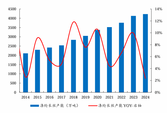 2014-2023年,涤纶长丝行业处于产能高速扩张期,产能稳步提升,据隆众资讯数据,行业产能从2014年的2103万吨提升至2023年的4128万吨,年均复合增速达7.78%。但从2024年开始,头部企业主动收缩扩产节奏,行业“反内卷”行为开始体现。涤纶长丝在2024年仅新增产能97万吨,同比增速大幅放缓,较2023年仅有2.35%的增速。