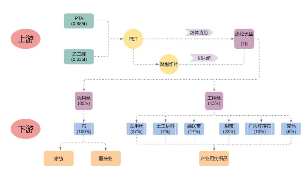 聚酯纤维是最主要的PET产品,而涤纶长丝是应用最广泛的领域。PTA主要与乙二醇(MEG)聚合生产PET,消费占比达到95%。PET产品依据产品形态和用途不同,可分为聚酯纤维、聚酯瓶片、聚酯薄膜,占比分别为75%、20%、5%。聚酯纤维是最主要的PET产品,其根据纤维长度不同又可以分为涤纶长丝(千米以上)和涤纶短纤(几厘米至十几厘米)。据百川盈孚,2024年我国涤纶纤维行业产量为6226万吨,其中涤纶长丝产量为4980万吨,占比79.99%;涤纶短纤产量为1246万吨,占比20.01%涤纶长丝是应用最广泛的领域。涤纶长丝主要用于服装家纺,熔体直纺和切片纺是其主要的生产工艺。据百川盈孚,2023年我国涤纶长丝52%用于服装,33%用于家纺,15%用做工业丝。