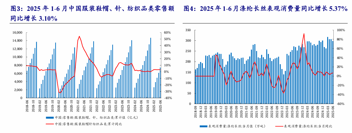 根据Wind的数据,2025年1-6月中国服装鞋帽、针、纺织品类零售额累计达到7426亿元,同比增长3.10%;涤纶长丝表观消费量在2025年1-6月累计达1785.50万吨,同比增加5.37%,保持稳健的需求增速。在进一步强化内循环和刺激国内消费的背景下,我们认为纺服消费仍会保持稳步上升趋势,将带动涤纶长丝需求提升。 展望三季度,涤纶长丝在秋冬季产品面料中本身占比较高;国内外双十一等采购活动也集中于下半年;同时,目前下游原料库存处于历史低位,随着宏观气氛和油价转稳,高温天气逐步收尾,下游开工及采购有望逐步恢复并过渡到旺季节奏,因此我们仍看好“金九银十”旺季行情。目前虽然是涤纶长丝行业的淡季,价差都在最低位置,但是随着8月份开始,行业价差有望逐步扩大,同时因为行业自律协调,到了恒逸石化主导定价阶段,恒逸石化的单吨生产成本是三大巨头中成本最高的,我们认为涤纶长丝的定价也将提高起来。 我们认为如果涤纶长丝价差景气回升,将直接利好行业龙头企业,桐昆股份和新凤鸣。桐昆股份涤纶长丝产能约为 1350 万吨 / 年。2024 年公司实现涤纶长丝产量 1281.89 万吨,销量 1297.81 万吨。新凤鸣涤纶长丝产能达 805 万吨,市场占有率超 12%,稳居国内第二。2024 年,新凤鸣涤纶长丝产量为 754.24 万吨,销量为 755.39 万吨。 涤纶长丝下游需求 |