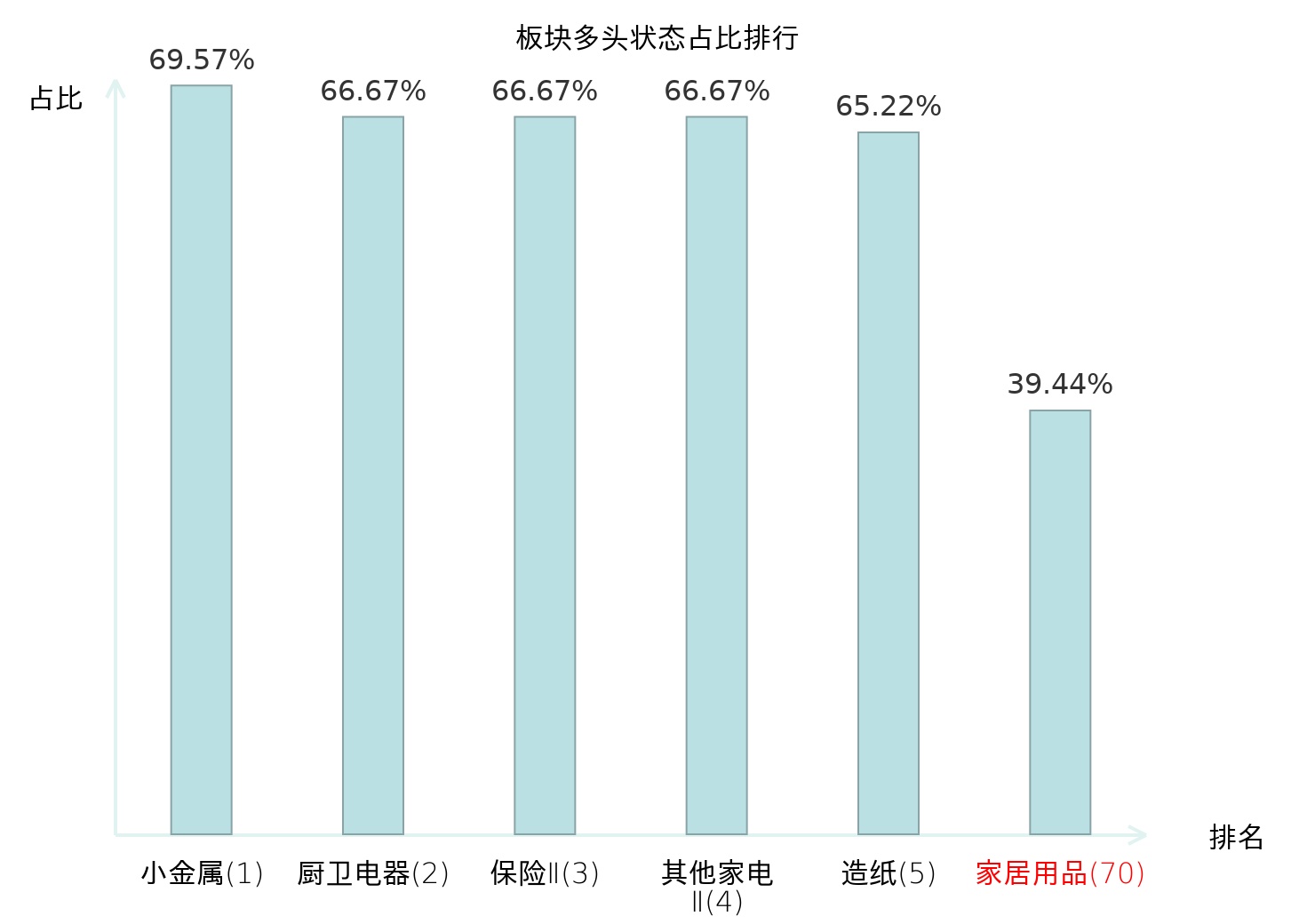 全市场所有行业板块中主力多头状态占比排名中,小金属板块位居第一。林业Ⅱ板块名次提升最快,较昨日上升86位。