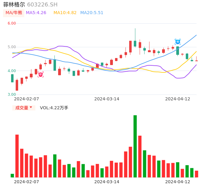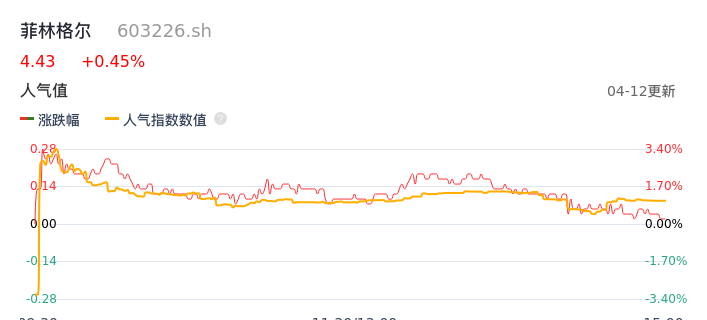 04月12日,菲林格尔收报4.43,股价涨幅0.45%,成交金额1894.94万元,换手率1.19%。