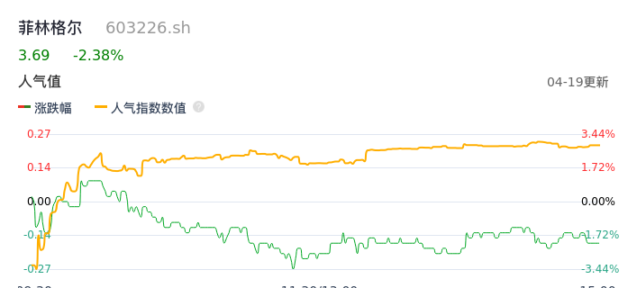 04月19日,菲林格尔收报3.69,股价涨幅-2.38%,成交金额1462.61万元,换手率1.10%。