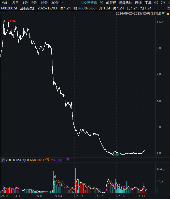3月进入退市整理期后,流动性急剧萎缩——日均成交额从高峰期的数千万元降至不足10万元,缺乏交易承接的股价近乎 “自由落体”,最终以0.29元/股收官,较年初缩水超96%。31日,上海证券交易所对公司股票予以摘牌,公司正式终止上市。