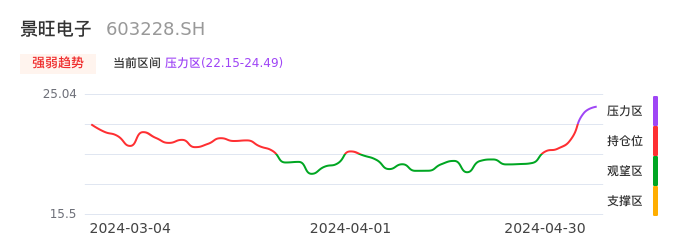 我们来看一下该股的九方特色指标强弱趋势的情况:景旺电子近日从持仓区进入压力区。股价出现一波快速拉升行情,目前上升动能较为充足可继续持股。注意今日上方压力位:24.49元是否能有效突破。